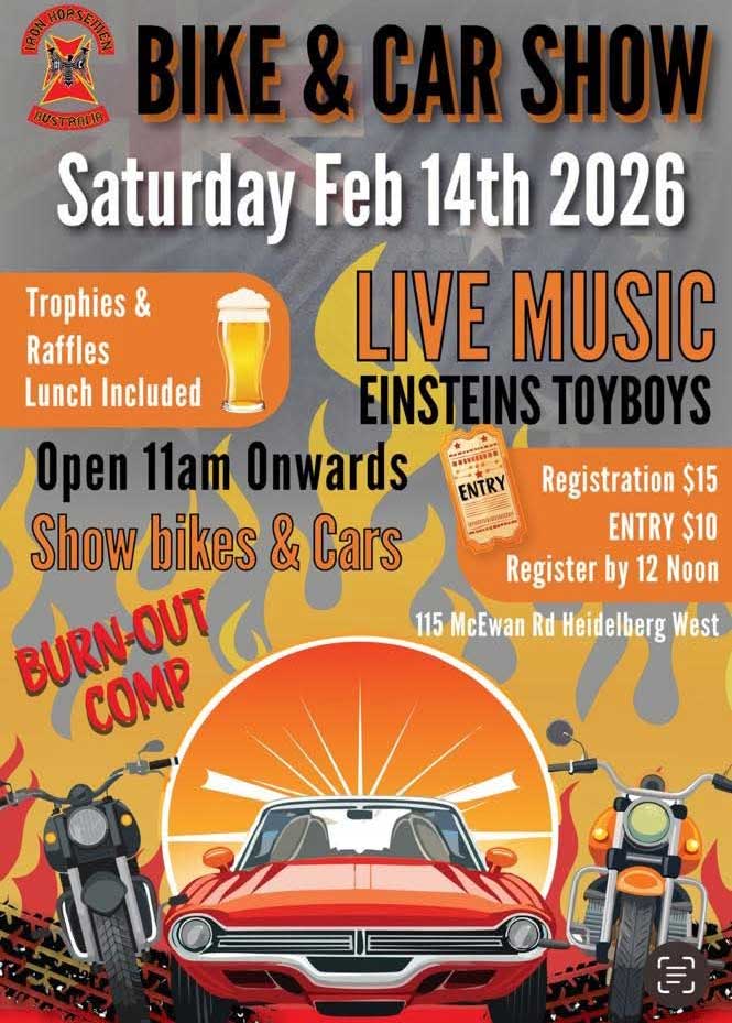 | Sat | Feb 14th | Iron Horsemen MC Bike and Car Show | 115 McEwan Rd Heidelberg West |