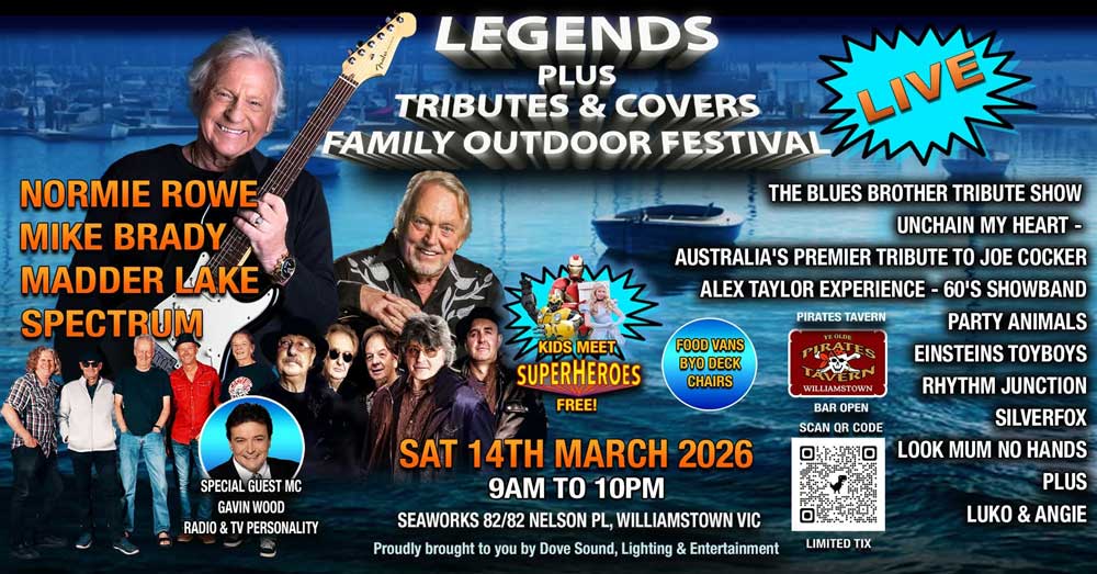 | Sat | Mar 14th | Legends, Tributes & Covers Festival | Seaworks, 82 Nelson Place, Williamstown |